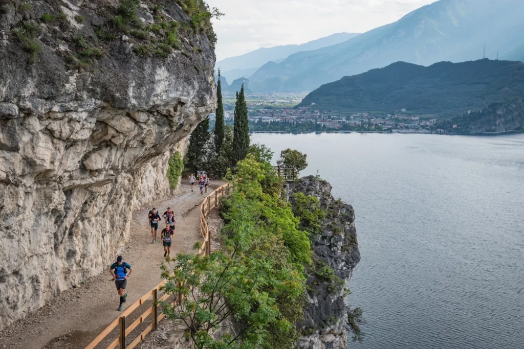 Les coureurs traversent notamment les reliefs sauvages du Val di Ledro et les balcons naturels dominant Riva del Garda, alternant montées raides, passages techniques et descentes rapides.