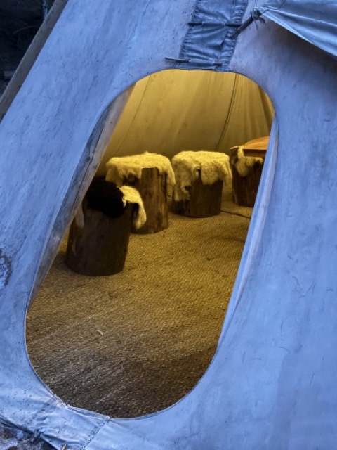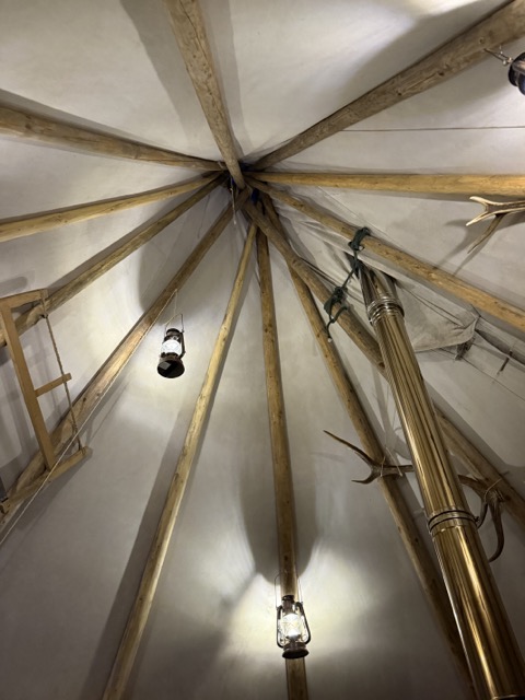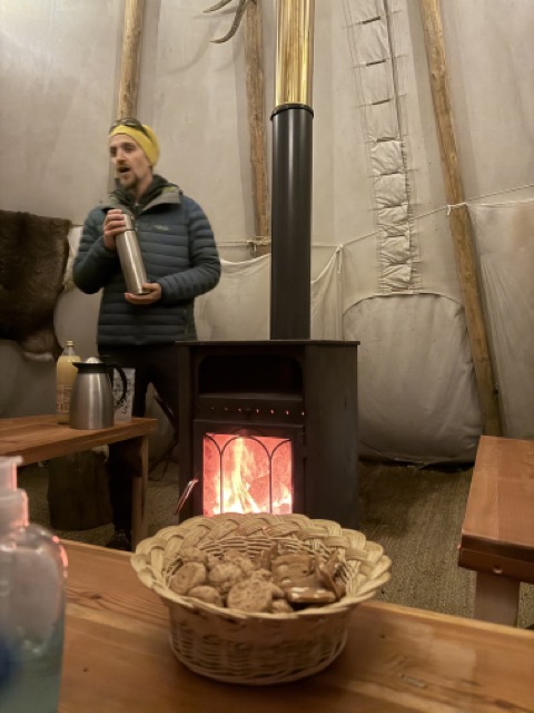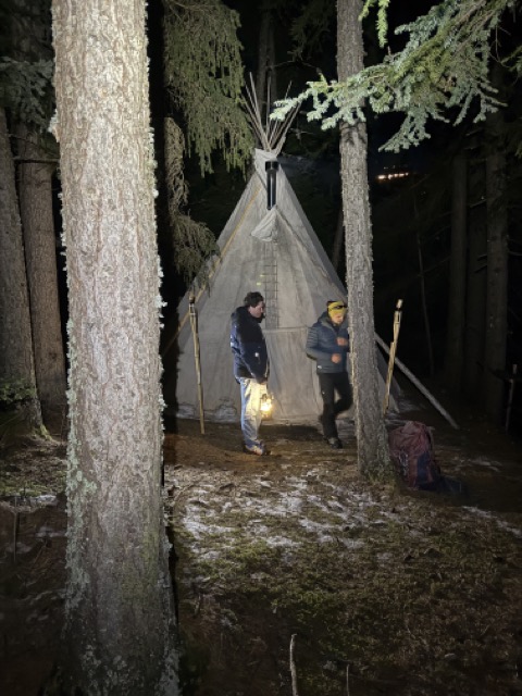 À l’intérieur, un feu crépite doucement et diffuse une chaleur réconfortante. La toile du tipi, les rondins de bois et la lumière du feu créent une ambiance intimiste, presque nordique, qui contraste avec le froid extérieur. Très vite, l’atmosphère devient conviviale et les échanges s’installent naturellement.